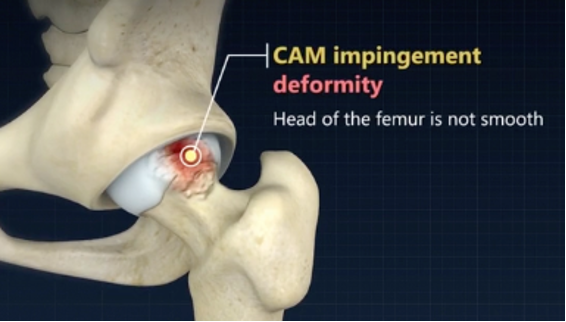 A „CAM” formájában összeütközés, azért fordul elő mert a combfej és a nyak anatómiája nem tökéletes, gyakran ellapult, és emiatt extra csont képződik az ízesülő csontok szélein (oszteofita), ami aztán felelős az ütközésekért.